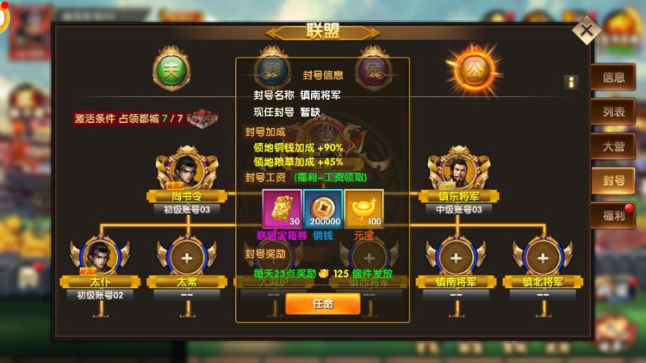 ⑤封号:当联盟占领了指定数量的城池之后,即可开启等级的官职,盟主可手动任命盟主内成员担任官职,且可领取相应奖励