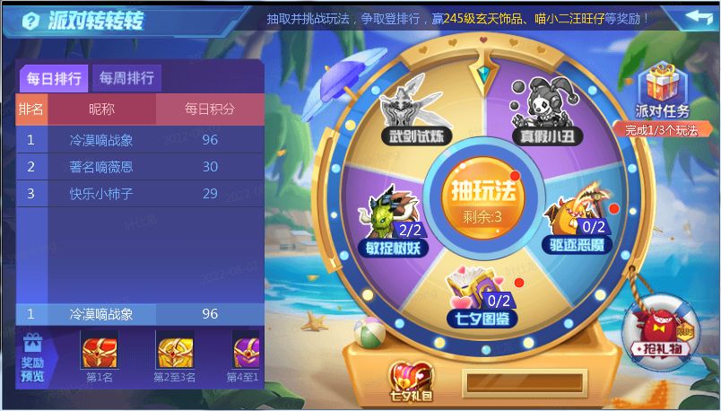 在限定时间内将剑刃投向滚板,成功通关能够赢取派对积分、瑶瑶碎片、筋斗云碎片等奖励。