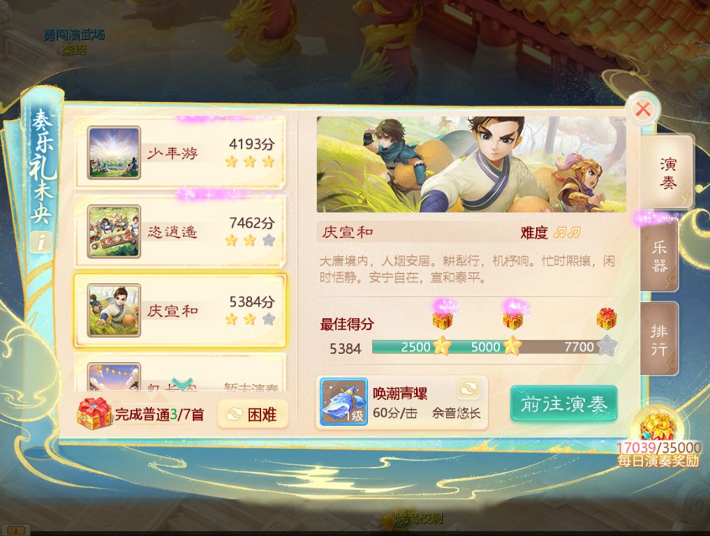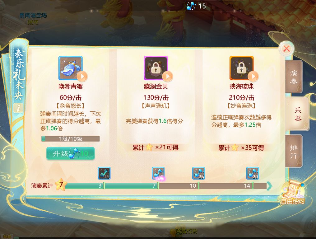 侠士可前往龙宫使用活动乐器演奏指定曲目,8月4日维护后开放7首简单难度的曲目供各位侠士演奏;剩余7首更高难度的曲目将在次周开放。演奏结束后,颜如玉会根据侠士的得分给出星星,每个曲目最多获得三颗星并发放道具奖励。侠士可自由选择一首“得意曲目”计入演奏排行榜中。