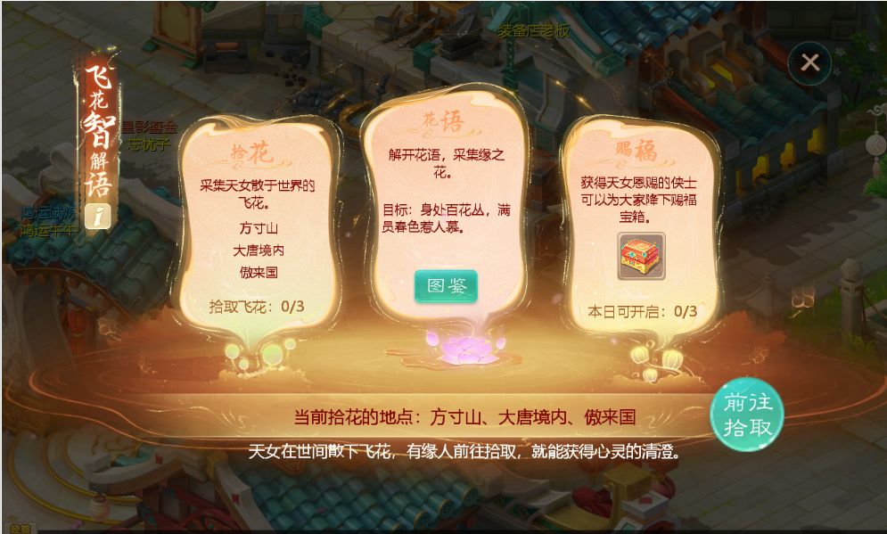 天女在世间散下飞花,有缘人前往拾取,就能获得心灵的澄澈。天女每隔15分钟会在3个场景撒下花朵,采集花朵并达成对应条件即可获得道具奖励!