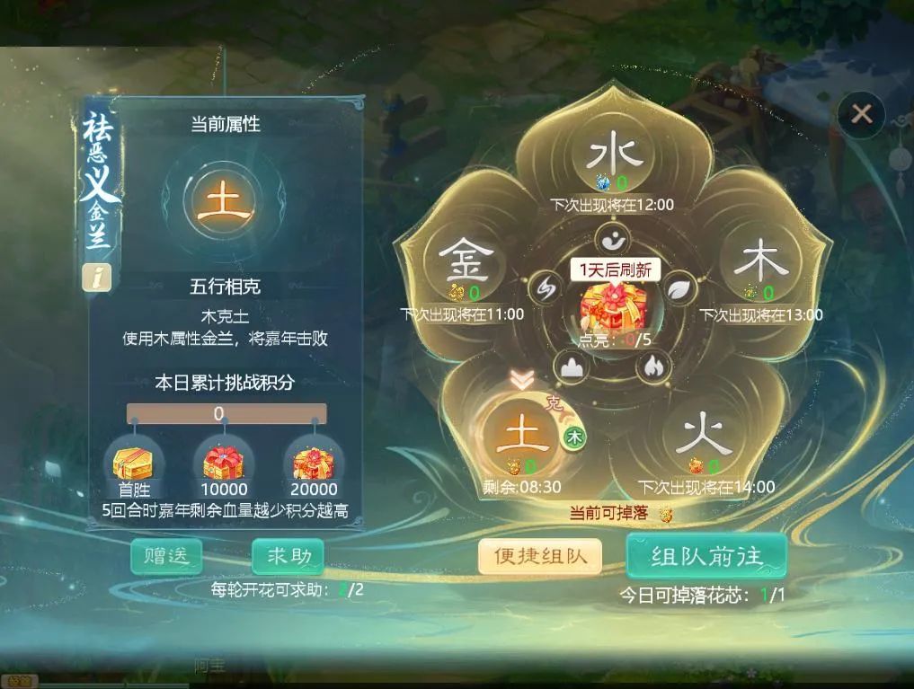 “嘉年”拥有水、木、火、土、金五个初始属性,每小时会按顺序轮换一次。对场上的【五相金兰】使用普通攻击可让其在战斗中转换属性,若其属性克“嘉年”可造成大量伤害;属性生“嘉年”则会为BOSS回复大量气血。侠士需根据对应任务要求调整【五相金兰】的属性来达成目的。