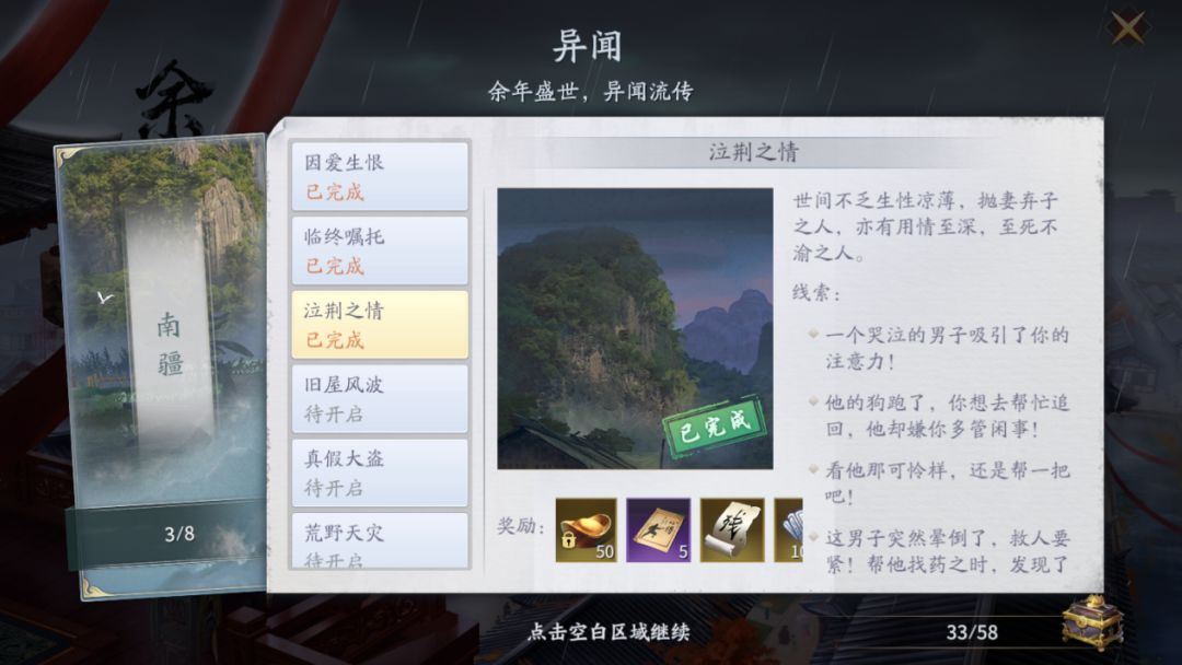 获得异闻奖励的同时,我们也能感受到新增的南疆异闻故事都相当精彩,有市井百姓间的动人真情,有江湖动荡的巨大威胁,也有秘法失传的现世遗憾等等,小编在这里就不完整剧透了,毕竟故事还是需要各位少侠亲自来体验比较好嘛~