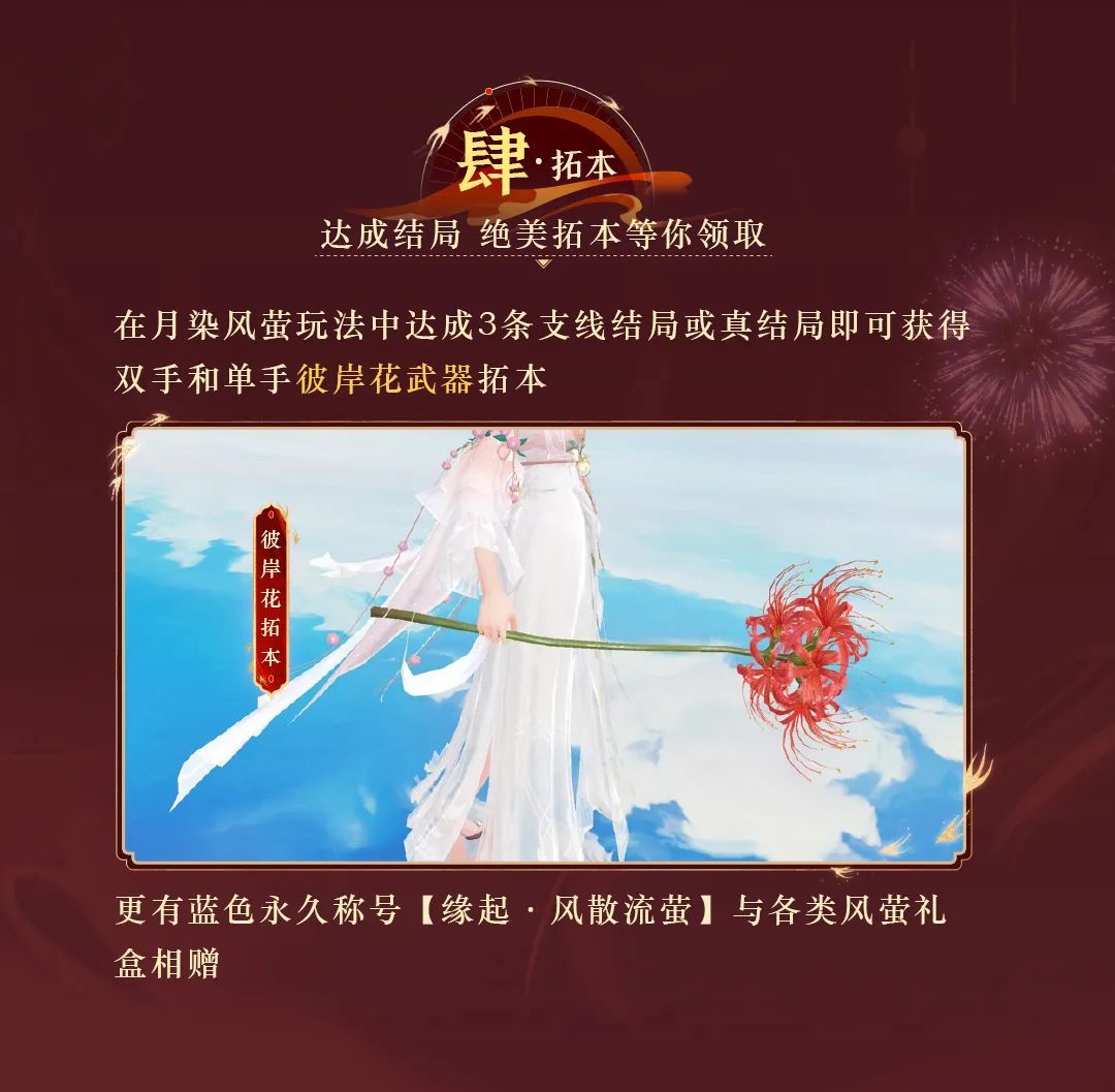 在月染风萤玩法中达成3条支线结局或真结局即可获得双手和单手彼岸花武器拓本。更有蓝色永久称号【缘起·风散流萤】与各类风萤礼盒相赠。