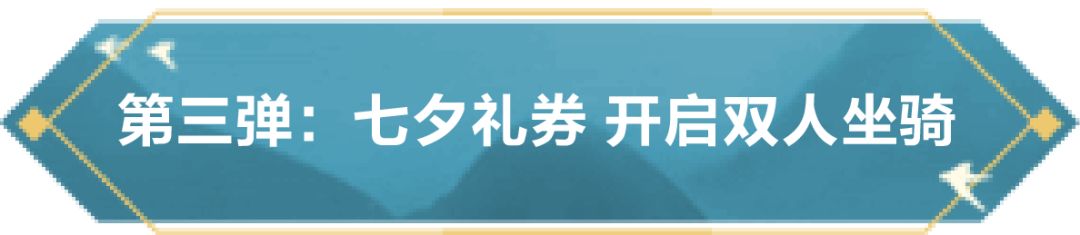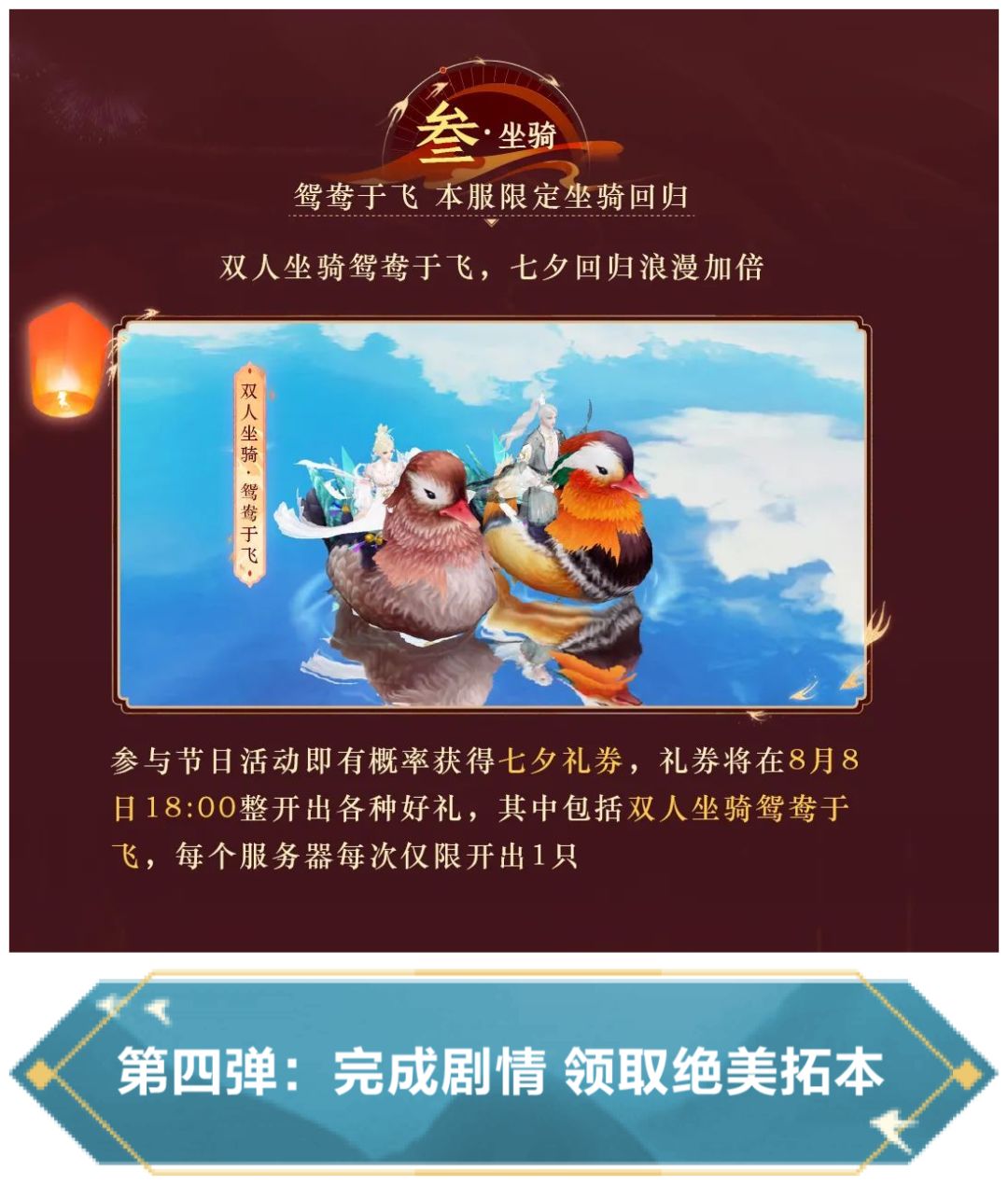 活动期间,参与节日活动即有概率获得七夕礼券,礼券将在8月8日18:00整开出各种好礼,其中包括双人坐骑鸳鸯于飞,每个服务器每次仅限开出1只。