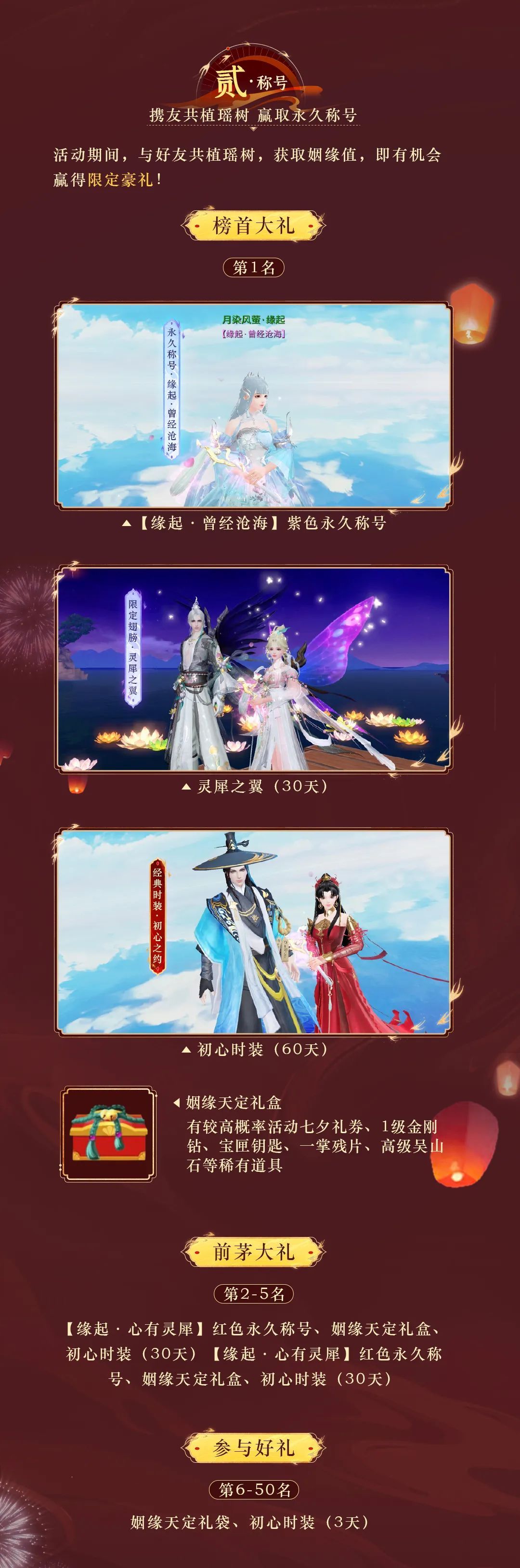8月3日-8月7日七夕活动期间,50级及以上玩家可邀请一位好友共植瑶树,获取姻缘值,参与排行榜!