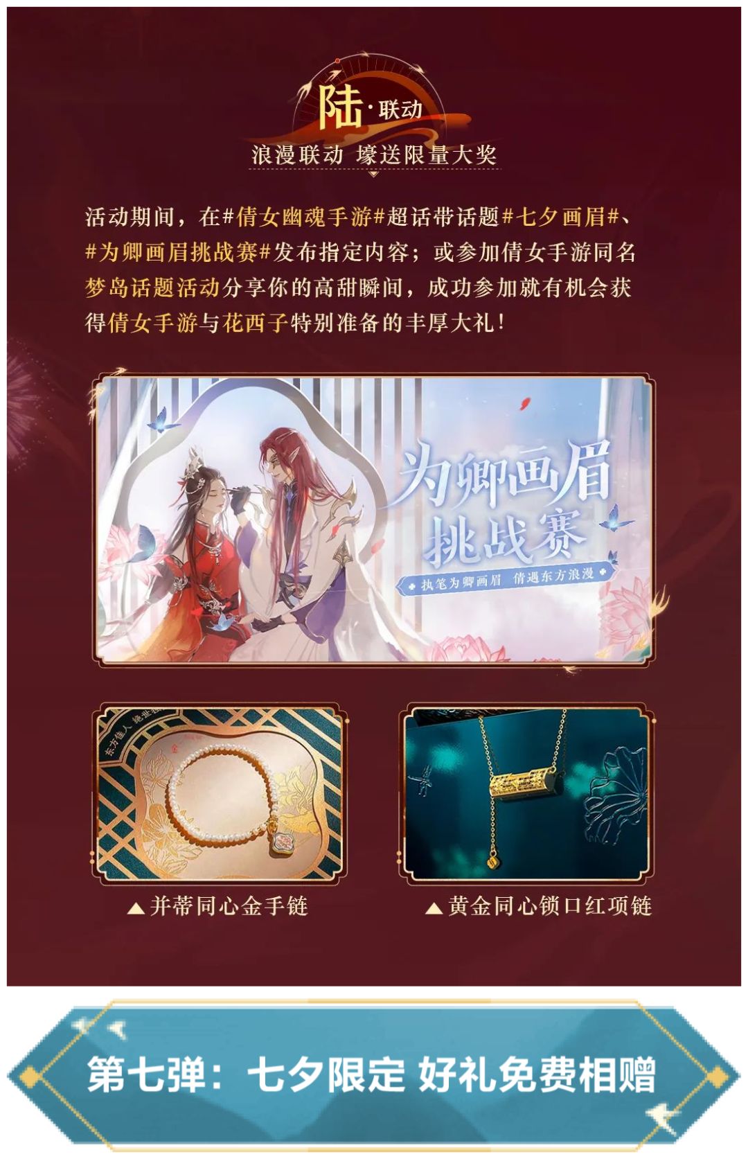 在#倩女幽魂手游#超话带话题#七夕画眉#、#为卿画眉挑战赛#发布指定内容;或参加倩女手游同名梦岛话题活动分享你的高甜瞬间,成功参加就有机会获得倩女手游与花西子特别准备的丰厚大礼!倩女手游「倩般恋你七夕礼盒」、花西子「并蒂同心妆匣」等多重大礼等你献给最爱的TA,快来参加吧~