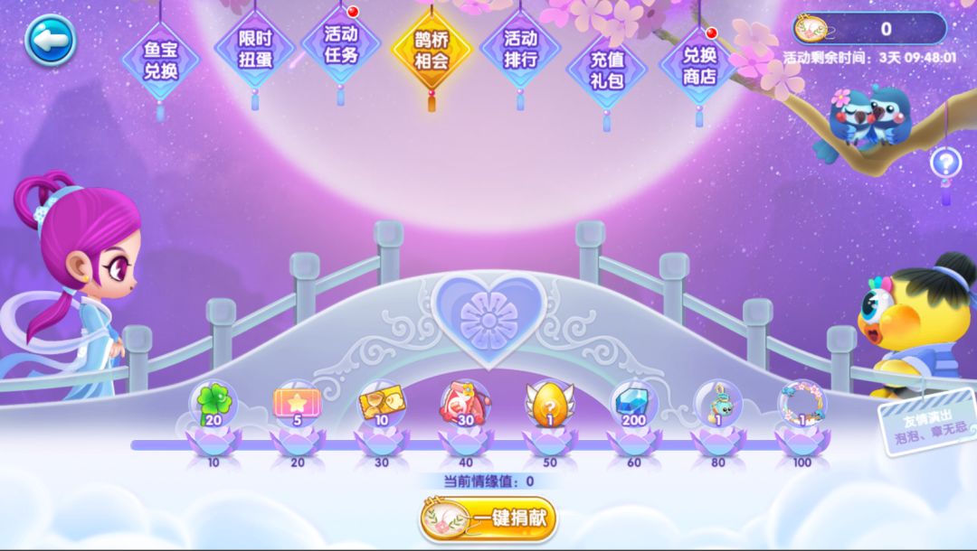 七夕活动中,馆长可以拿鱼宝兑换刺绣,并在鹊桥进行捐献。每次捐赠即可累计进度,获得七夕专属好礼!