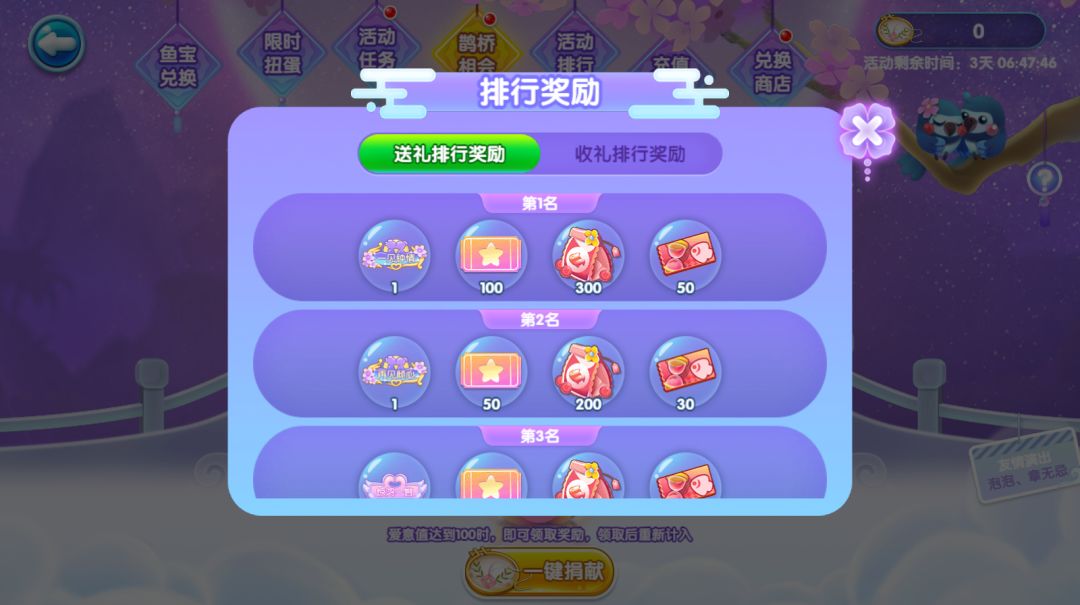 活动期间开启限时礼物排行榜,好友鱼池赠礼可为好友增加人气值,还有限时七夕礼物道具【凤蝶步摇】【定情梳】【同心佩】为情意加分!(活动结束后限时道具可折价回收);