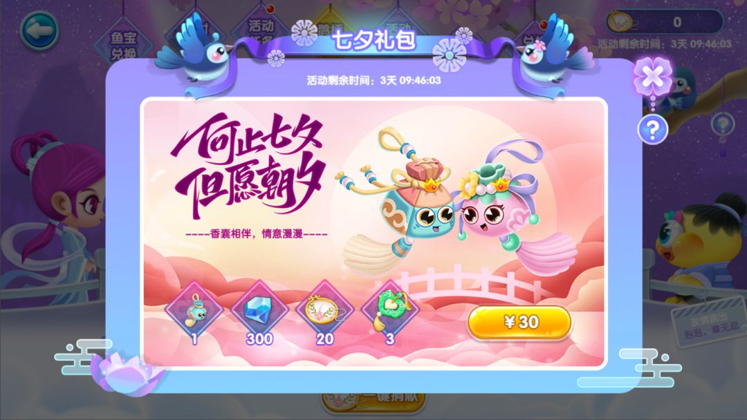 绵绵情意,礼包先行~七夕充值礼包开启,内含新鱼【苏叶香囊】、钻石、活动道具等好礼,助力甜蜜时刻!