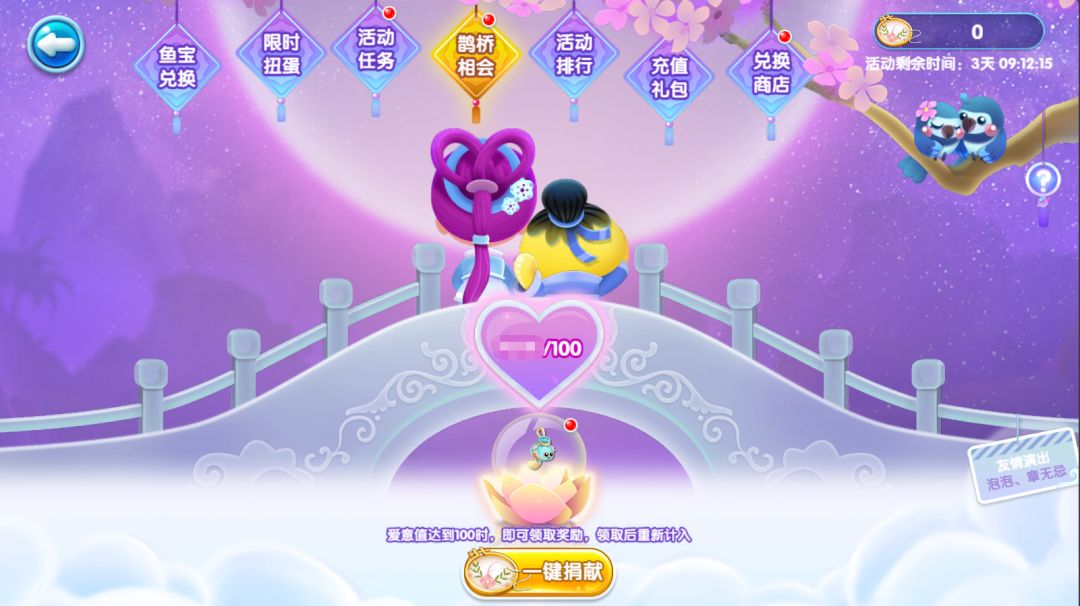 当情缘值达到100完成进度后,有缘人即可鹊桥相会并点亮爱意值小心心,馆长可以继续捐赠刺绣,与泡泡一起赏月,获得苏叶香囊哦!