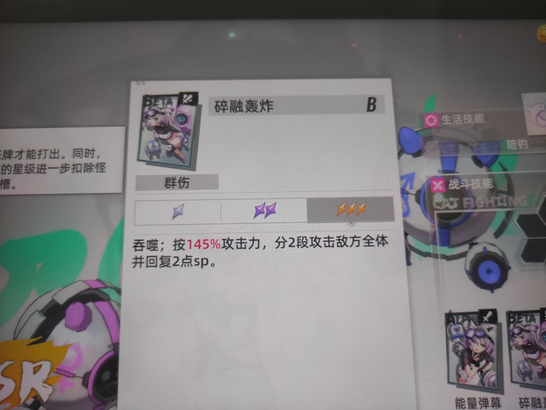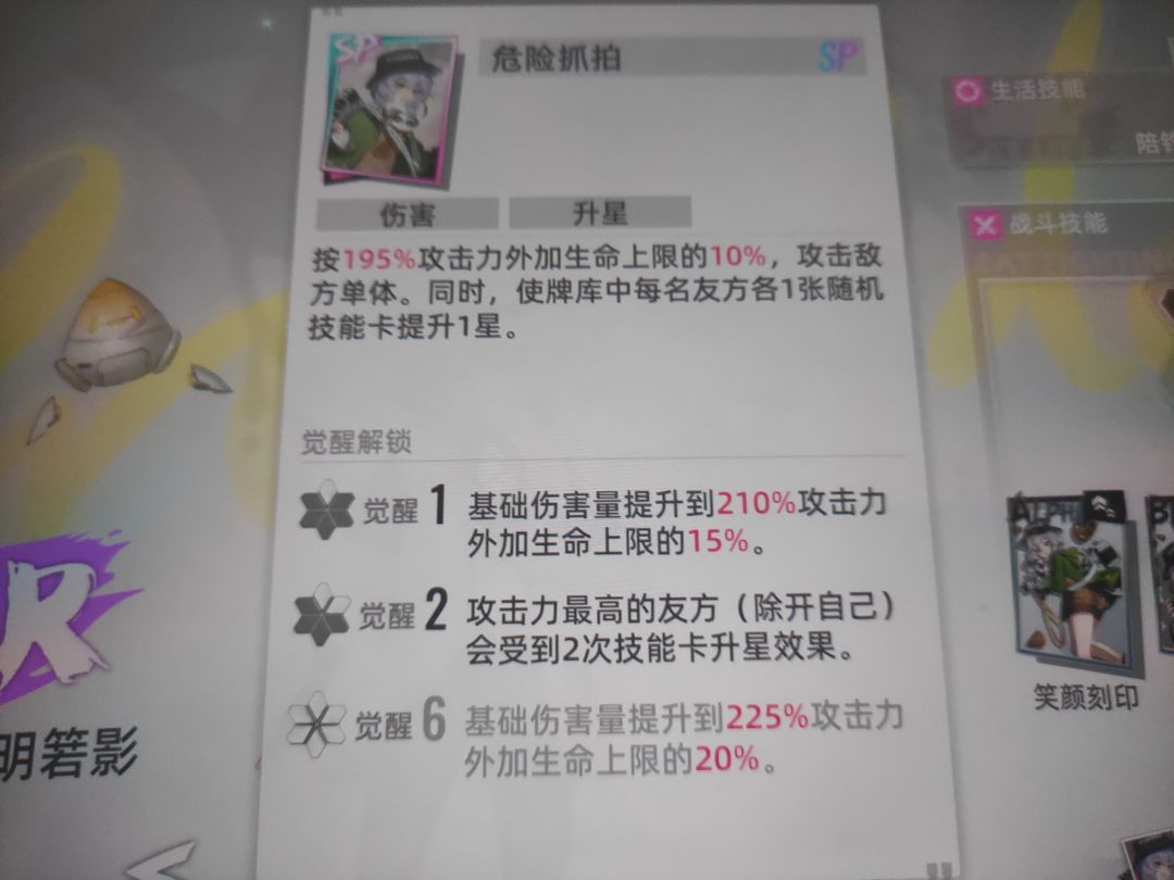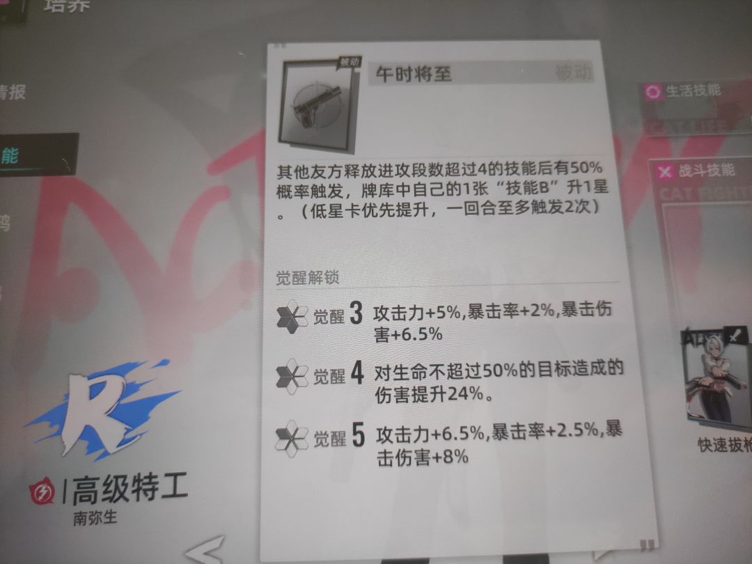 最后一个高级特工,也是我比较犹豫的一个点,但零度放a技能可以配合高级特工的被动,相当于放一个零度a技能不仅可以给零度b升星,都有一半的几率给高级特工的b升星,增加伤害输出,并且就是因为零度是群攻,而高级特工的大招,有一个斩杀回三点sp的功能,而她只有4点sp,如果给他带猪的涂鸦,相当于大招斩杀即刷新,可以用来收割残血。并且我看她数据好像还挺强力的