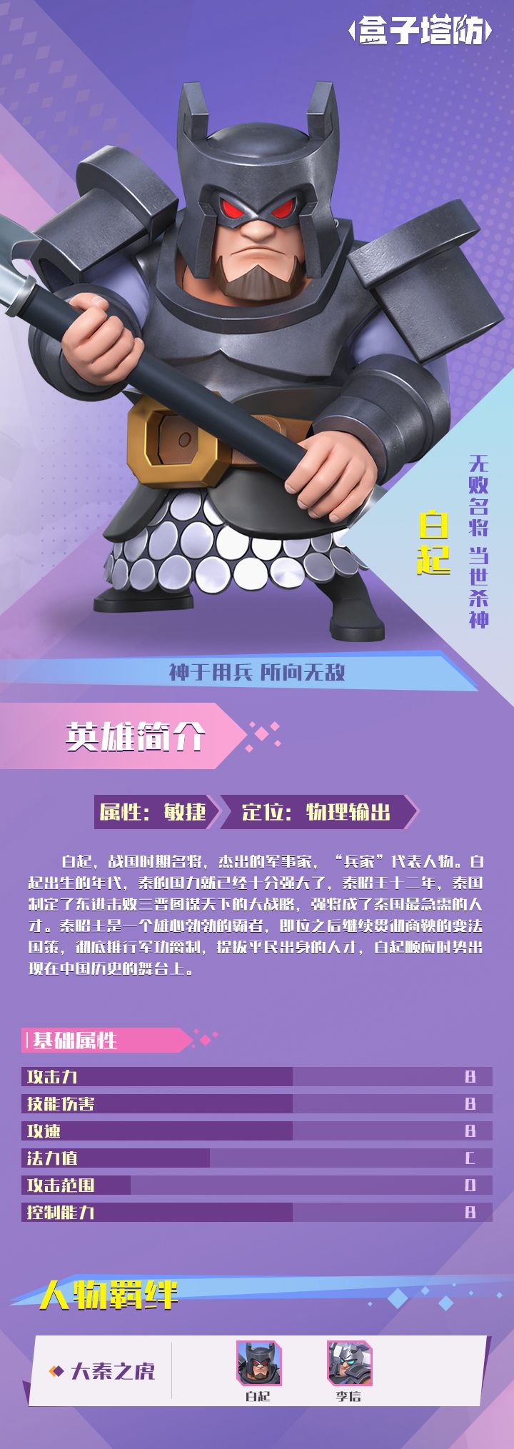 亲爱的小伙伴们: 今天带来紫色英雄「白起」详情介绍: 技能展示: 召唤数个士兵进行攻击,击杀怪物还可...
