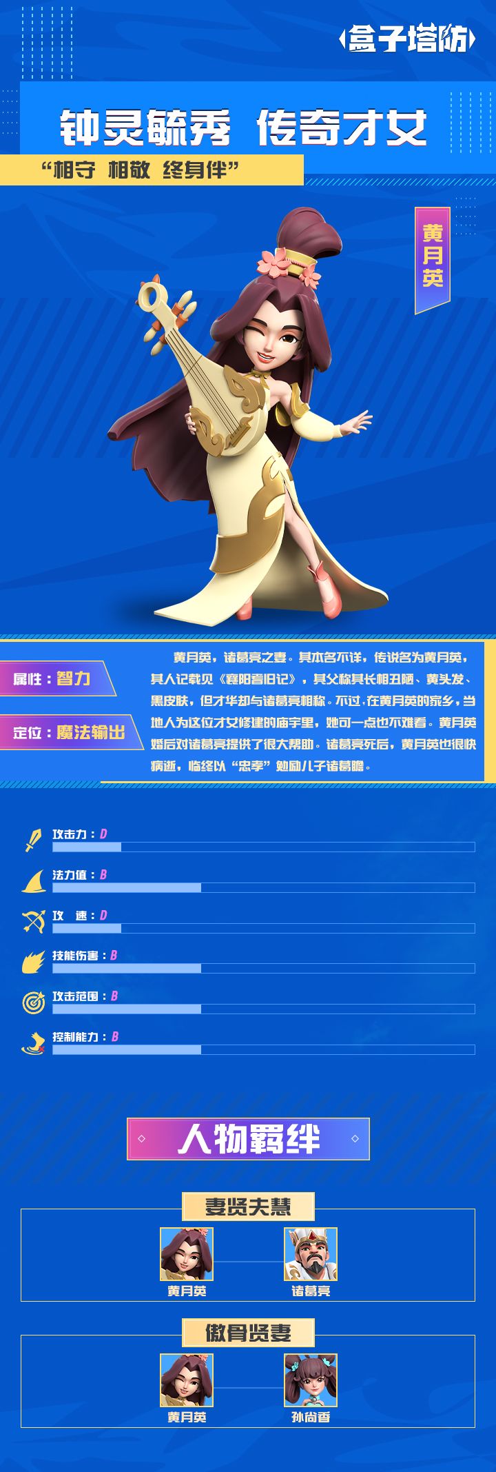亲爱的小伙伴们: 今天带来蓝色英雄「黄月英」详情介绍: 技能展示: 弹奏一曲,对范围内敌人造成多段魔...
