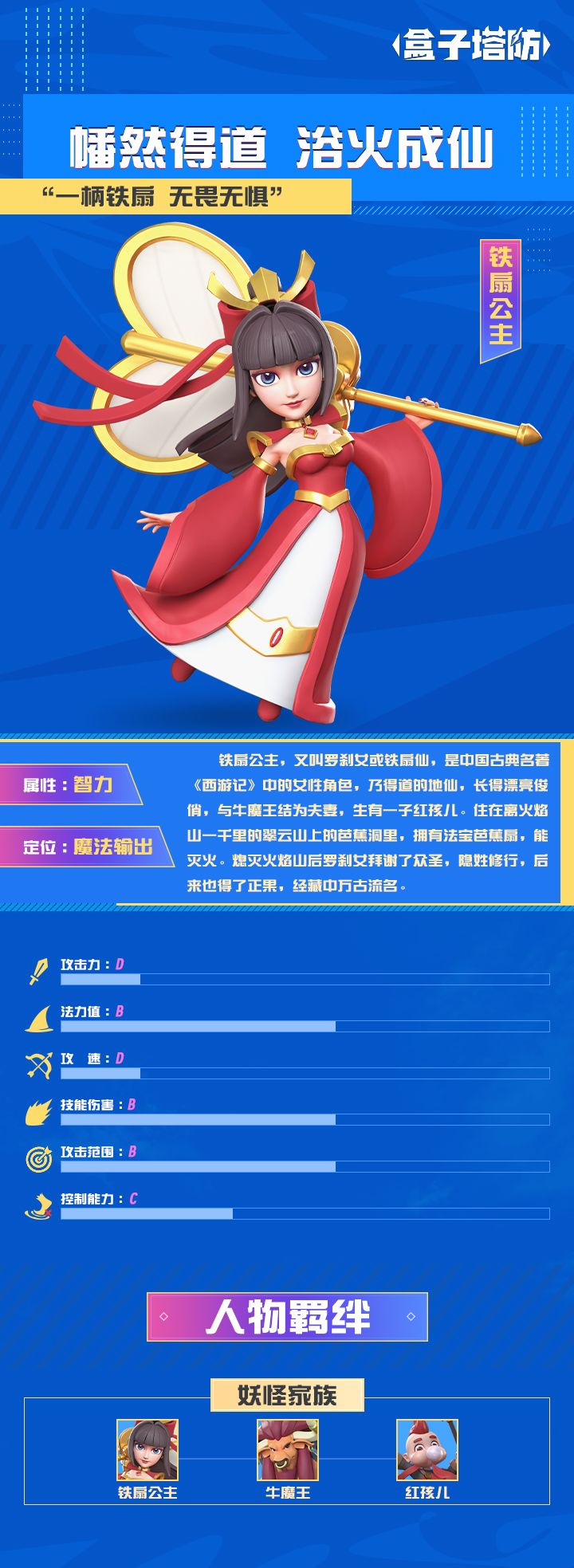 亲爱的小伙伴们: 今天带来蓝色英雄「铁扇公主」详情介绍: 技能展示: 用力扇出一阵强风,对范围内敌人...