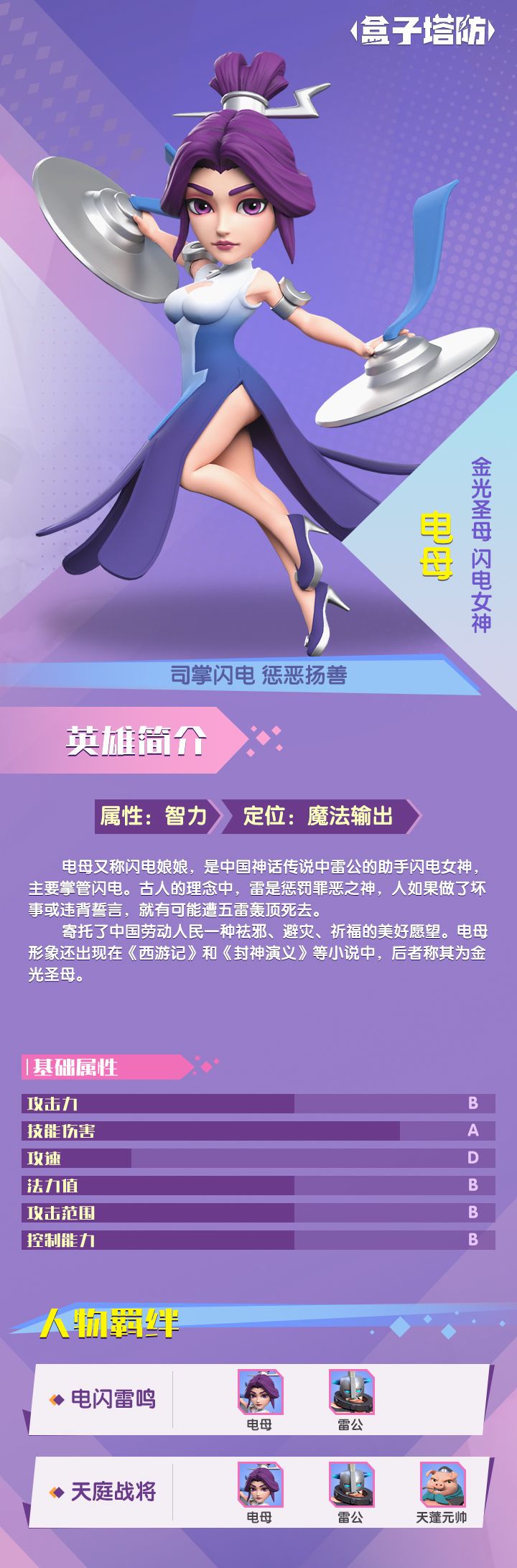 亲爱的小伙伴们: 今天带来紫色英雄「电母」详情介绍: 技能展示: 自带多重攻击且对攻击的敌人造成短暂...