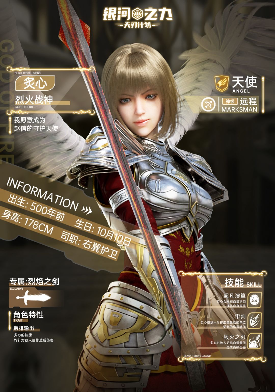 天使炙心,生于500年前,属于天使星云的高阶护卫天使,司职右翼护卫。手执烈焰之剑跟随凯莎征战百年,是凯莎忠诚的追随者。同时与彦并驾齐驱,是凯莎的两大护卫之一。