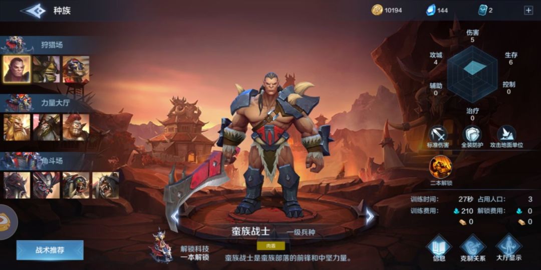 蛮族的输出兵种一本兵在狩猎场和角斗场,而辅助兵反而在力量大厅,个人觉得吧,对战中输出为主辅助为辅,输出的兵往往出的还是比较多,所有这种选择还是比较适合的。