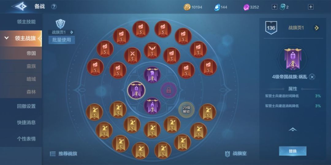 首先说说帝国,我们对帝国的玩法一般比较注重三本来出兵,一本和二本兵一般需要适当出兵防守,这种出兵当时就比较适合带这种战旗。