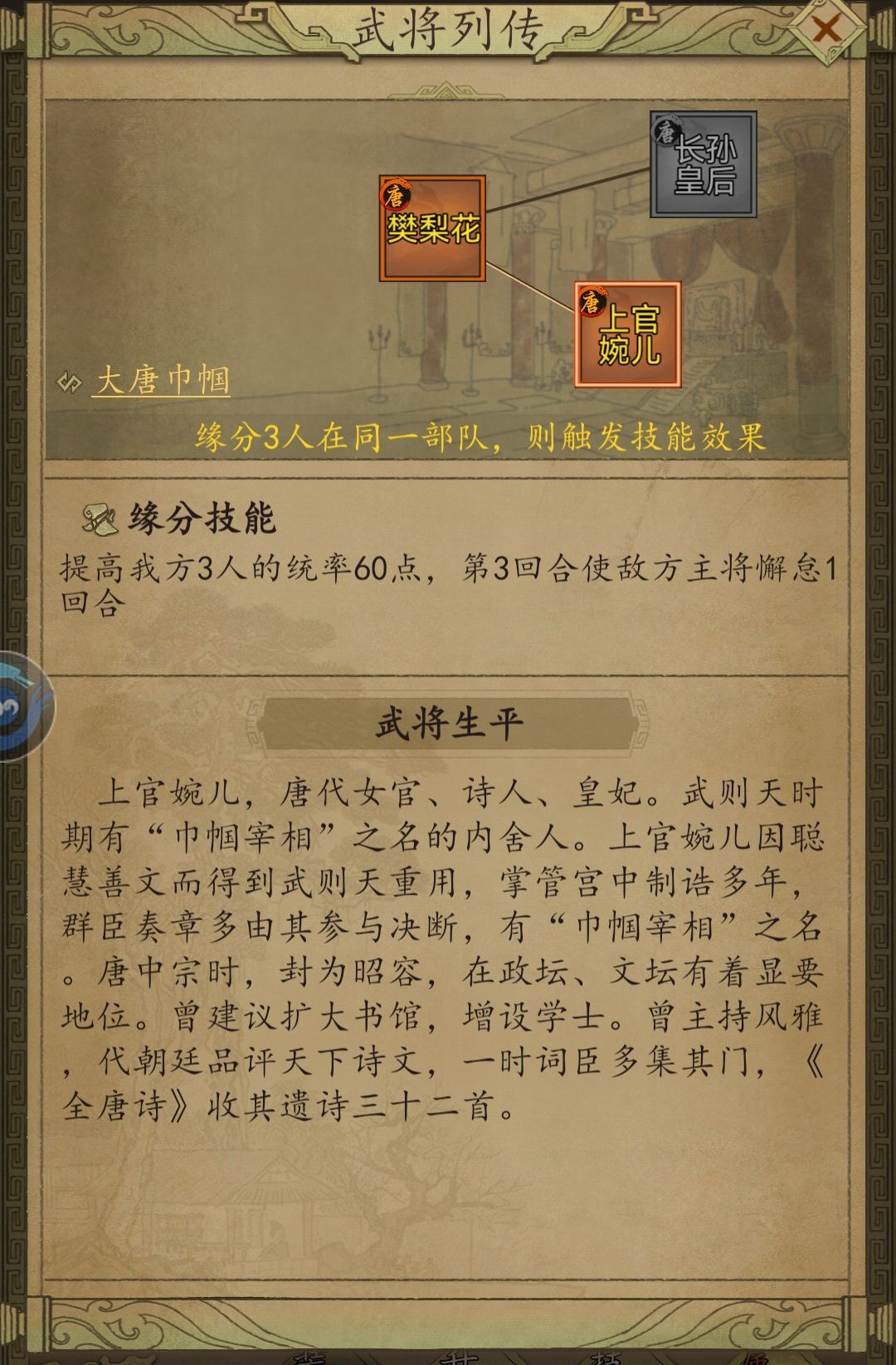 三个武将都非常有特点。樊梨花的关山度飞输出是非常高的,堪称最暴力技能;上官婉儿的唯用一心续航能力很不错,对标同类型的魏征恢复系数更高且发动率高了15%;长孙皇后的增益百搭。然而她们的组合却毫无优势:首先输出全靠樊梨花,然而樊梨花的输出虽高却并不具备单点爆破能力,且输出不稳定,不可能与爆头骑相比,可以说浪费了前三回合先攻能力;其次该阵容没有任何硬控,也没有免控,樊梨花和上官婉儿的技能还都是主动技能,非常惧怕控制;再次,上官婉儿的恢复能力虽强,但阵容整体防御力不强,跟法队差不多;最后,三人的成长性都不高,尤其是上官婉儿,智力成长只有堪堪1.32。除此之外,羁绊效果也作用不大。