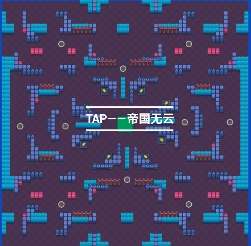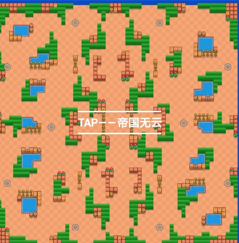 上下左右对称的一张图,内圈基本上没有草丛。两边是两条狭窄的长条草丛,紧贴着地图的侧边。中场区域有八个跳板,最中心是一个方形河流。