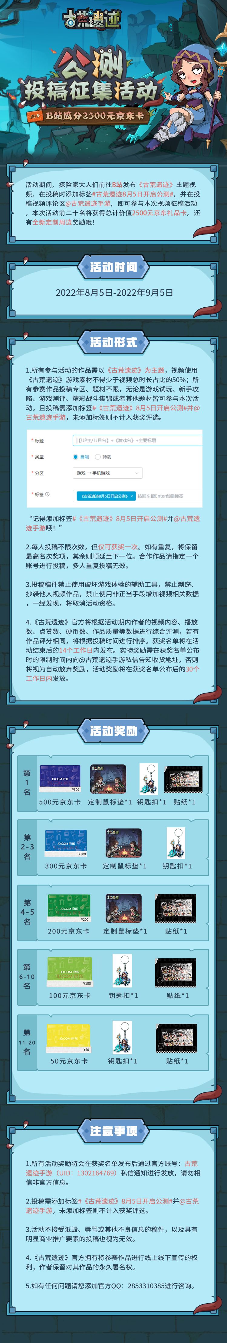 《古荒遗迹》公测来袭B站公测投稿征集,探险家大人们快快前往B站参与投稿,赢取2500元京东卡等周边好礼吧!