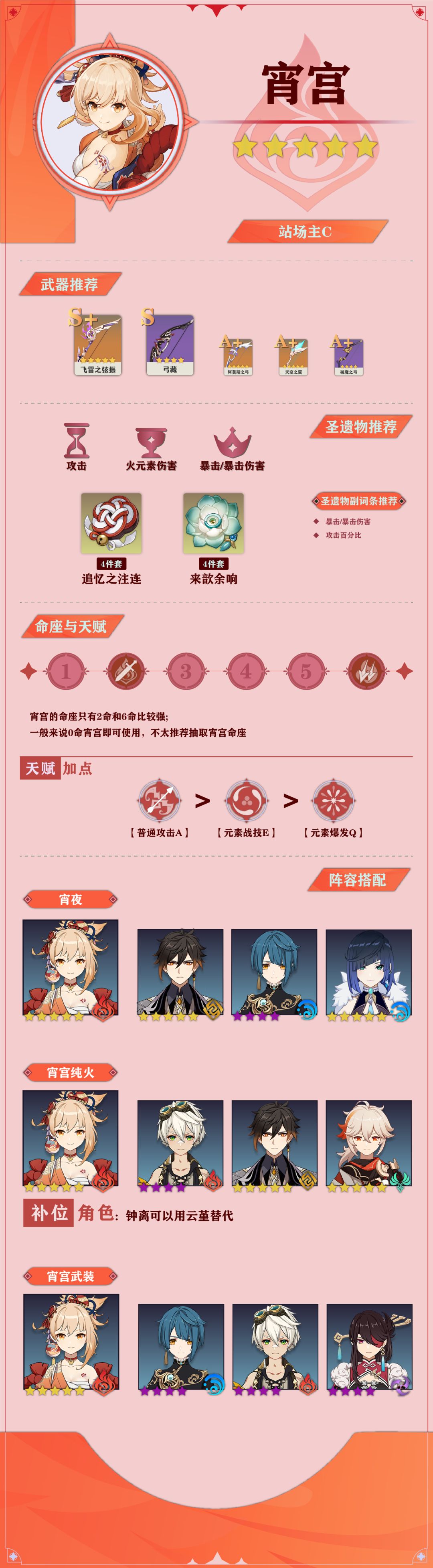评价:宵宫是一个五星火系弓角色,也是一个非常典型的站场主C角色。宵宫的优势在于对单输出比较高以及拥有远程输出的能力,然而由于在宵宫之前,已经出现了比宵宫对单输出更强的胡桃,而且胡桃还有着一定的对群能力,甚至也是火属性角色,因此宵宫的定位就略显尴尬了一些,目前仅有对空时略有优势,而深渊出现飞行的敌人的情况并不算多,因此宵宫在绝大部分情况下上不了场。宵宫也有另外一个优点,即较低的培养成本。武器方面使用4星的弓藏即可毕业,圣遗物则是使用绝缘的副产物追忆,也不需要额外的资源投入。