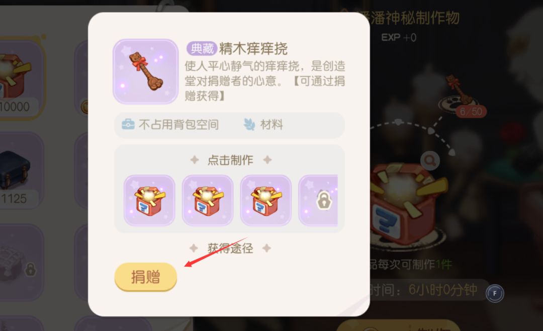 赠不同等级的家具/服装可获得三种不同的痒痒挠奖励,其中捐赠红色装扮会返还宝石痒痒挠,捐赠金色/紫色装扮会返还精木痒痒挠,捐赠蓝色及以下的装扮会返还竹木痒痒挠,其中除了宝石痒痒挠以外,几乎都是溢出的,而宝石痒痒挠则又几乎是依靠晶钻彩蛋以极慢的速度获得的东西