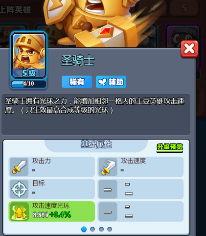 圣骑士:加baff增加相邻土豆英雄的攻击速度。