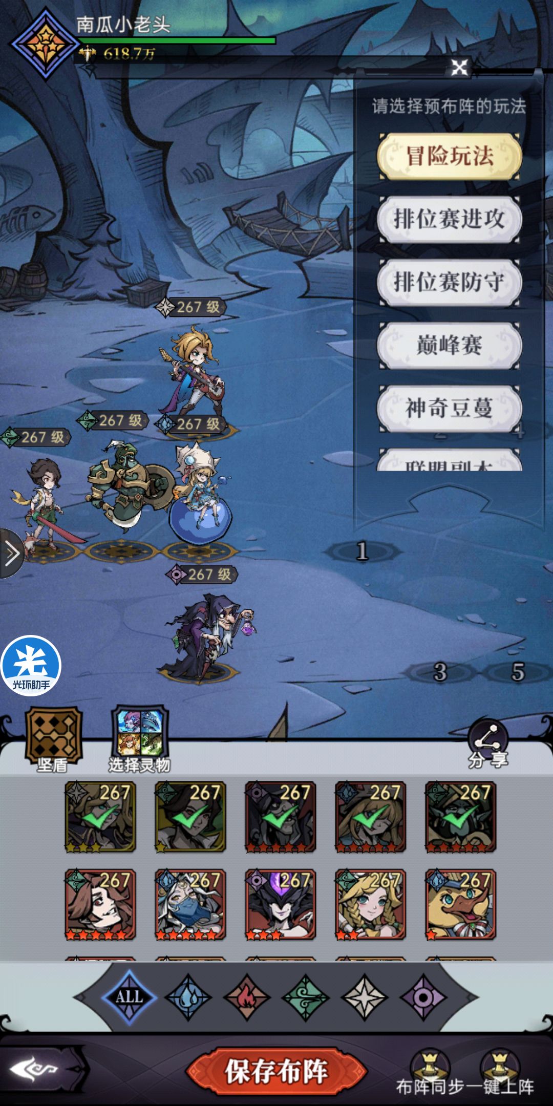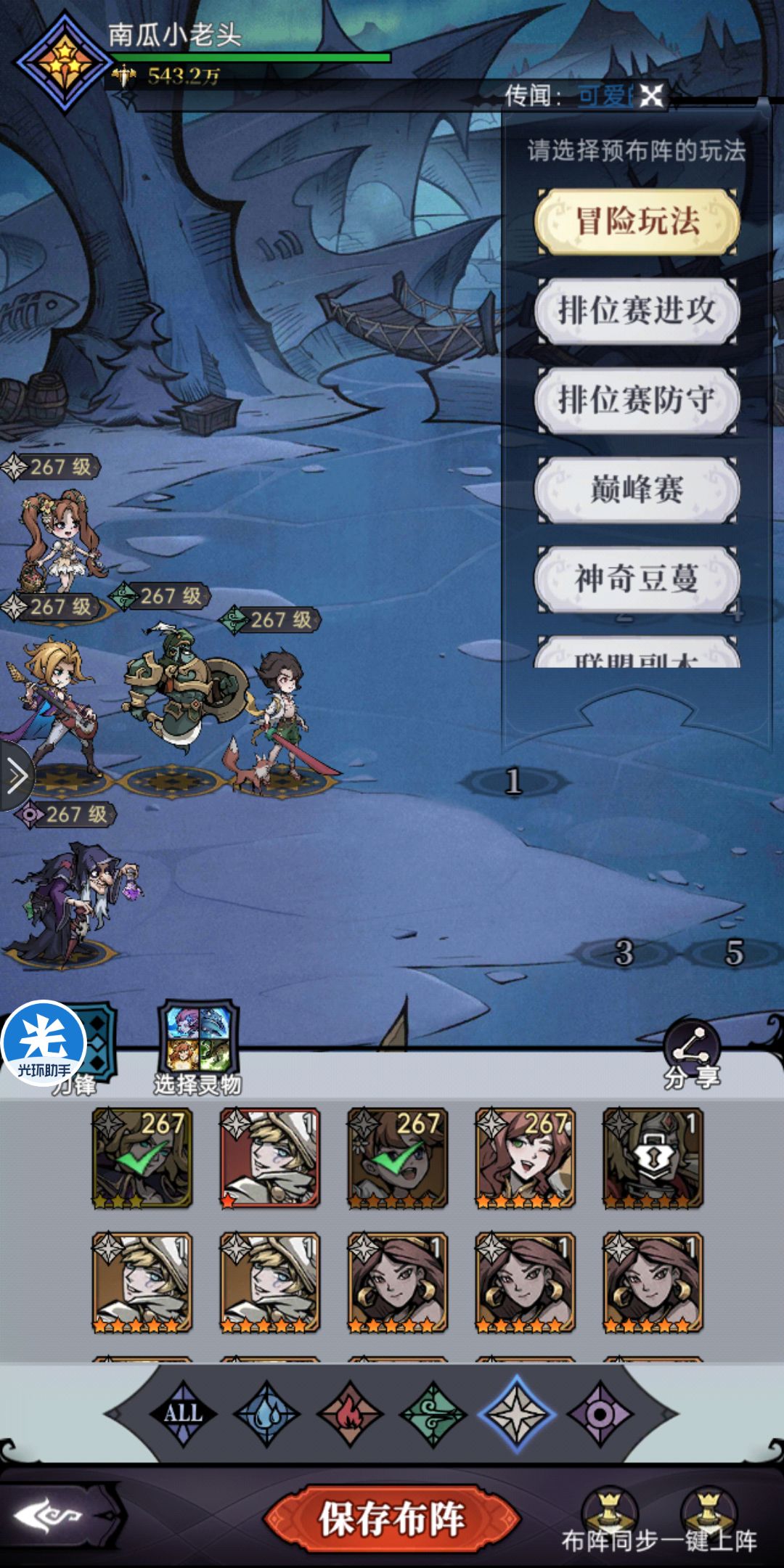 (3)阵容站位(参考):后期直接刀锋阵前排,前期打白雪坚盾后排(注意:小王子坚盾一定是放后排,不然章鱼嘲讽了你的灯神或者国王,那直接白雪抬走)