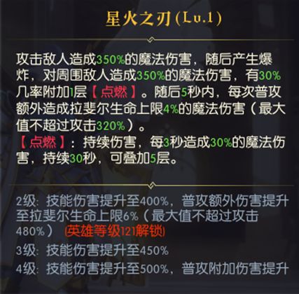 技能二能造成范围魔法伤害,有几率给敌人附加点燃,点燃能造成持续伤害,随即普攻能根据拉斐尔生命上限造成额外的魔法伤害。