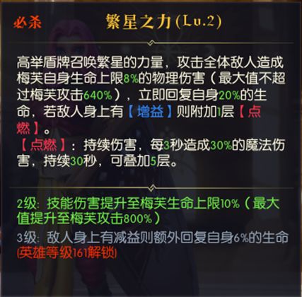 梅芙的必杀技能能造成敌方全体物理伤害,同时立即回复自身生命,如果敌人身上有增益效果则额外附加点燃,满级必杀还能给梅芙带来更高的生命回复。
