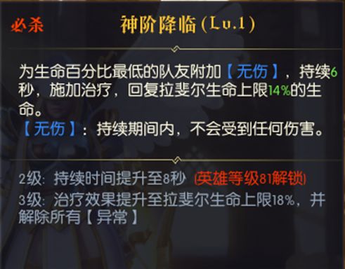 天使的必杀技可以说神技都不为过,给生命百分比最低的队友施加无伤效果,无伤意味着在效果持续时间内无敌,免疫一切伤害,同时回复队友生命值,满级必杀可以解除所有异常状态。拉斐尔必杀放的时机好不好,往往会决定一盘对局的走向。
