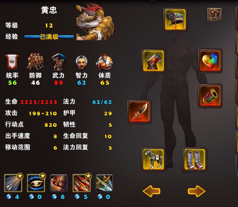 黄忠学好技能打败张任、恢复好状态后,就可以去打冷苞寨子了,黄忠装备如图,进入战场后第一回合黄忠使用如意天算技能,朱雀待机,虎卫上去,然后朱雀打武当和冷苞,注意不要围在冷苞周围,不然他会张飞的群体晕人技能,优先击杀武当和boss,当boss死后,回血效果便会消失,之后逐个灭杀对面小兵,注意利用好朱雀回血技能尽量减少损失(装备雀炎战术卡,站在朱雀周围1格范围内的单位,每过3回合会受到朱雀回血效果恢复一定血量),具体打法见视频,打完后记得换上回蓝装备,准备下一场战斗,附视频、截图