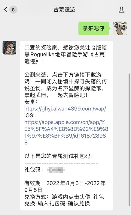 前往“古荒遗迹”公众号,回复“拿来吧你”即可领取公众号专属礼包!