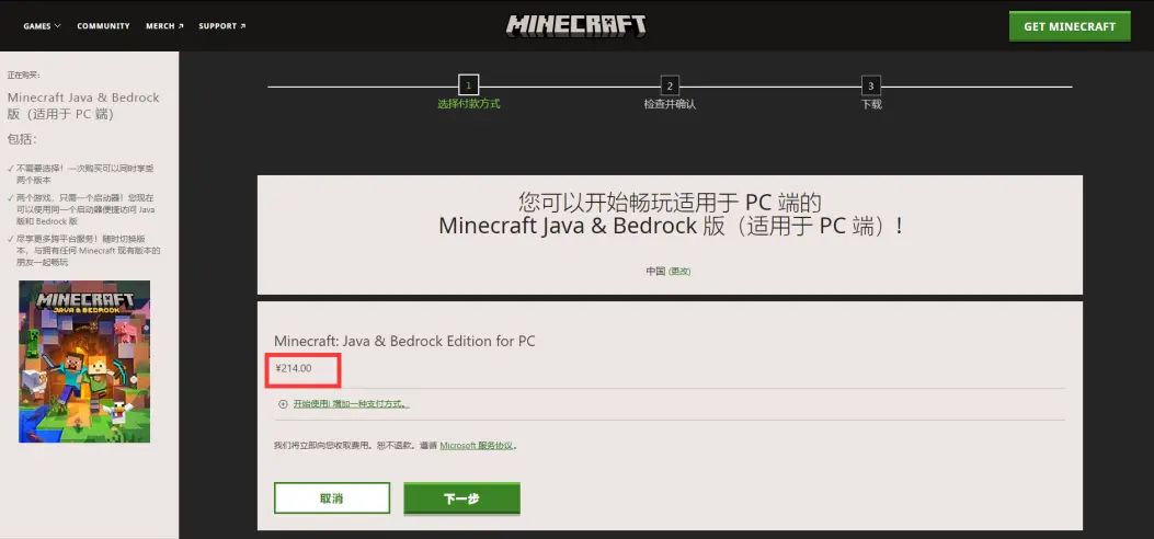 官网游戏购买接口更换为微软自己的接口后,Minecraft PC 捆绑包的人民币价格由¥89 上涨至 ¥214,成为价格第二高的付款区域。