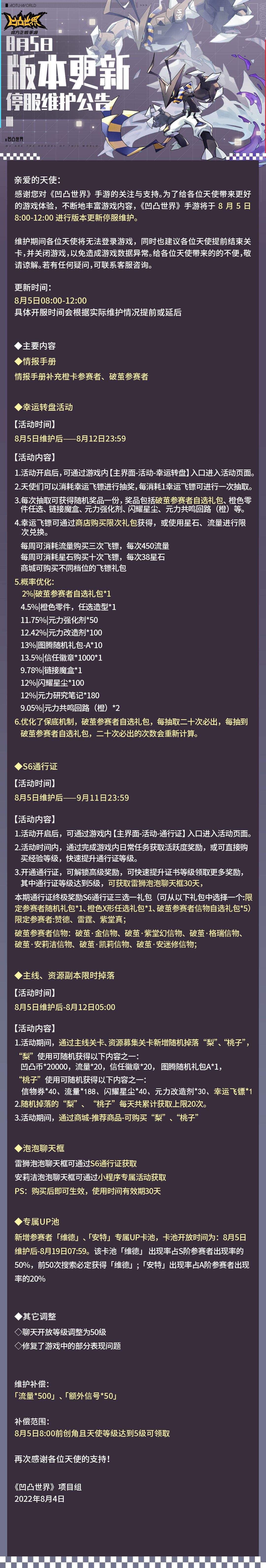 感谢您对《凹凸世界》手游的关注与支持。为了给各位天使带来更好的游戏体验,不断地丰富游戏内容,《凹凸世界》手游将于8月5日8:00-12:00进行版本更新停服维护。