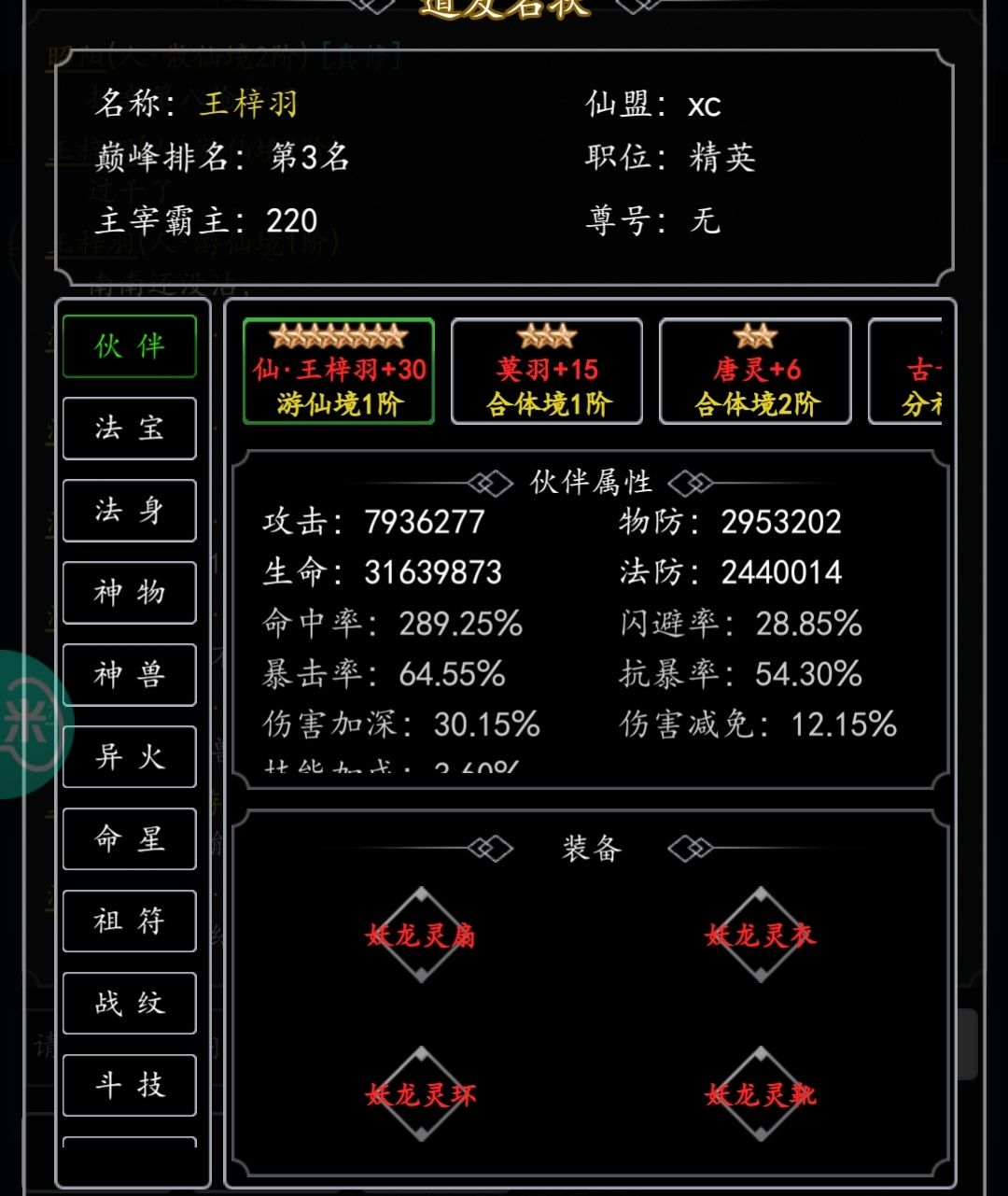 我玩这游戏也才33天,六氪,也不是什么大佬,前期在大乘卡了18天,来研究玩法搭配,前天才上的游仙,属性面板我不好看,图一乐就行了,今天只说阵容。