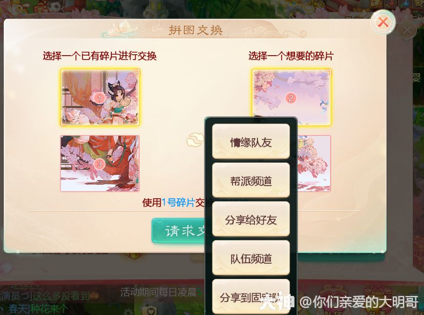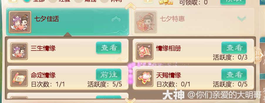 3.“天赐情缘”,每日活跃度累积到50和100时,将分别收到一个拼图碎片,多余部分可以与朋友交换,若是与有缘人共同完成拼图,还可获得情缘值奖励。