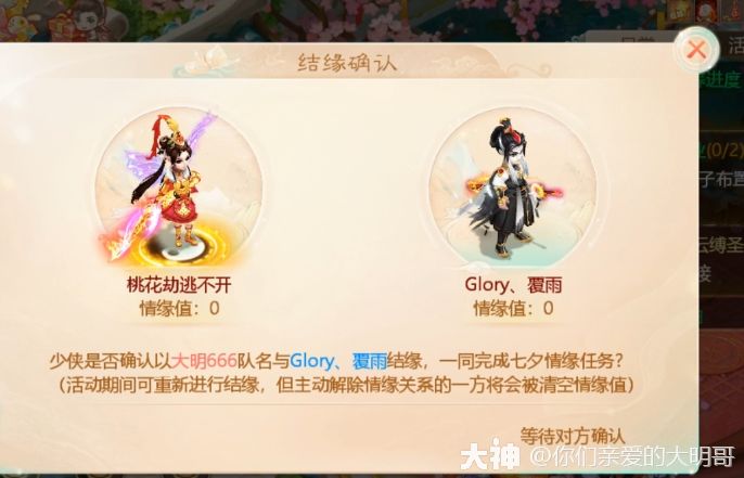 1.“三生情缘”任务需以双人组队的形式接取,和队友(不论男女)组好队后,就能确认结缘,开始每日任务挑战。接取任务之后,两位有缘人将马上生成一个七夕限时称谓,直至活动期后失效。