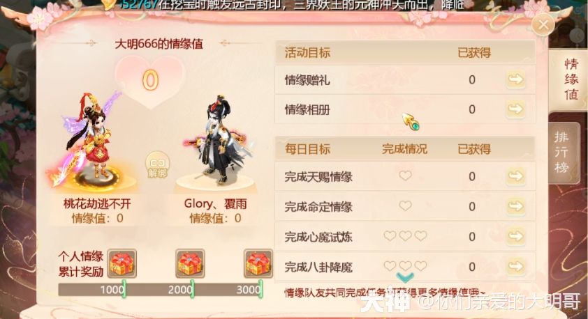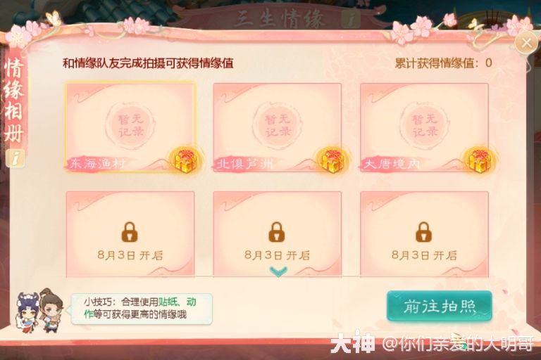 2.“情缘相册”,每天开放3个目标场景,少侠与有缘人前往这3个场景完成拍照,就能获得奖励和情缘值。