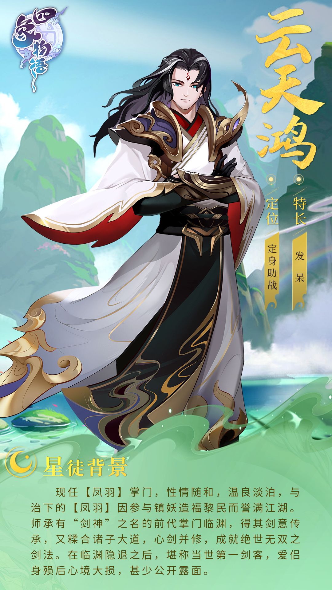 现任【凤羽】掌门,性情随和,温良淡泊,与治下的【凤羽】因参与镇妖造福黎民而誉满江湖。师承有“剑神”之名的前代掌门临渊,得其剑意传承,又糅合诸子大道,心剑并修,成就绝世无双之剑法。在临渊隐退之后,堪称当世第一剑客,爱侣身殒后心境大损,甚少公开露面。