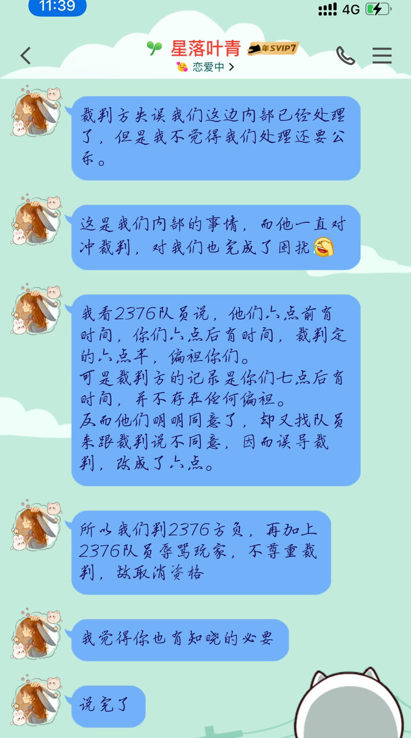 1.我和负责人重新联系后,发现对面是知晓并且认同下午6.30打的(看下面截图),但是对面的队友又重新找裁判理论要求改时间,从始至终我们没有找裁判确定或者改时间,只有裁判给我们下达时间,两次时间(6.30,9.30)我们都认同,看图,并且对方在今天屡次发帖,说他们没确定好时间等等,言行不一,扰乱公众视线,非常可笑。
