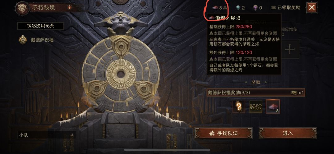 建议:每日3次暗影会箱子刷完,每周组队把灰烬的额外获取上限120刷满,然后就自己单刷更快。上限查看如图。