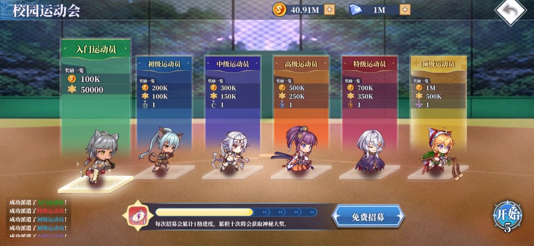 参赛:作为老师,也是班级的组织者,你可以在每次比赛指派集结5名运动员阵容参赛,每次比赛都默认“入门“”运动员参赛,你可以消耗钻石重新随机招募1名运动员,每隔一段时间还会获得免费招募机会哦,直至安排好一支完美的团队参赛!