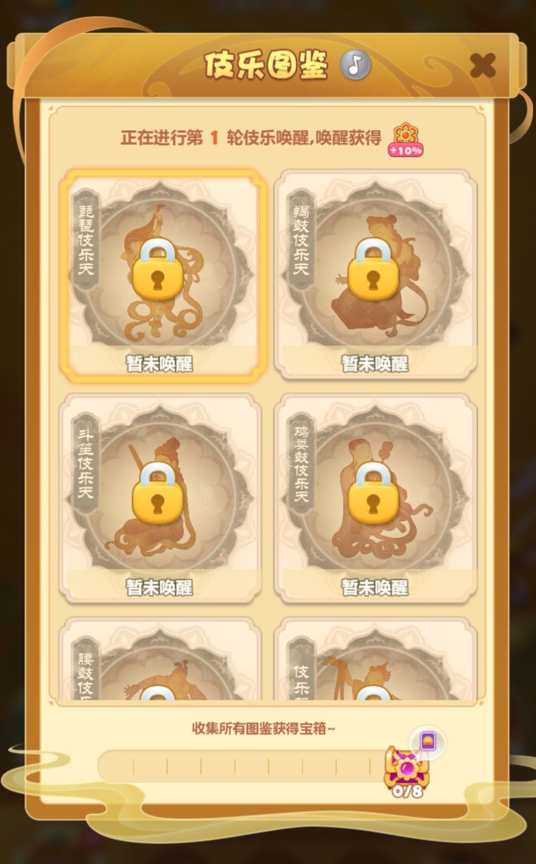 本期活动共有8位伎乐,消耗音符可将其唤醒并收录至伎乐图鉴中,点击查看图鉴能了解敦煌乐器知识,还能听到对应乐器的音色哦~