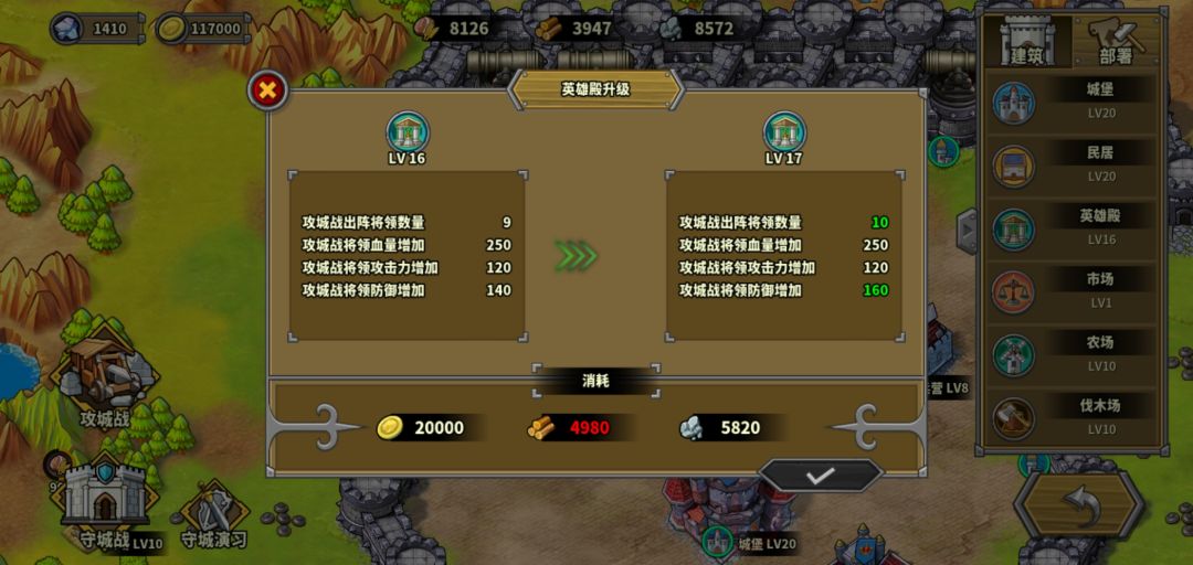 2.4、英雄殿可以确定的是20级可以出征12个将领,属性加成很多(特别是防御)。再往上说不准,可能20级满级,也可能28级满级,对应出征16个将领。