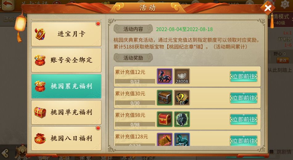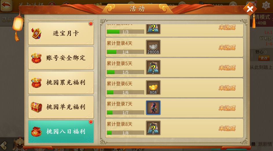 桃园庆典期间8日只要登录游戏都有各类奖励领取。