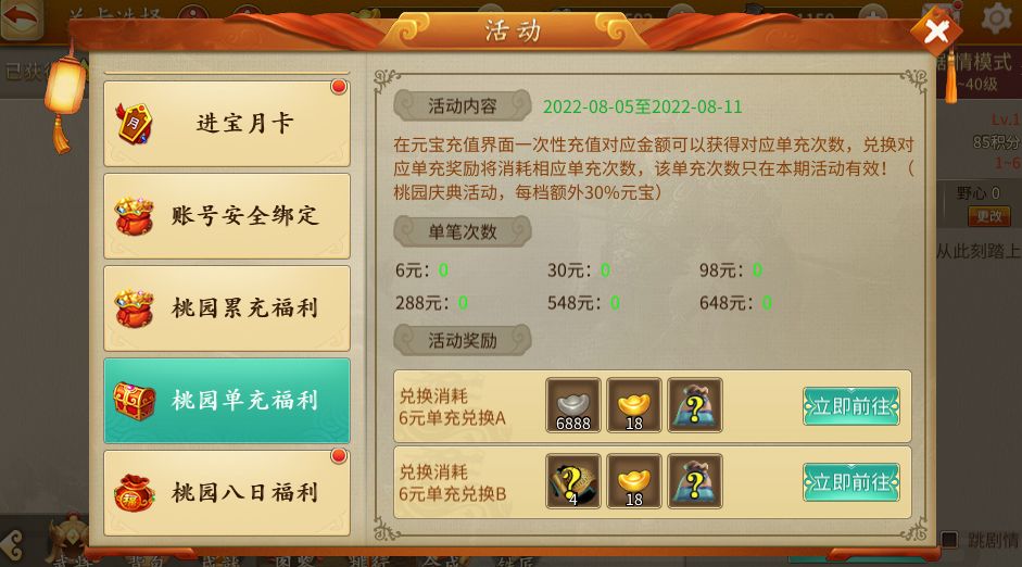 单充兑换中会有额外元宝、庆典福袋,非常划算。