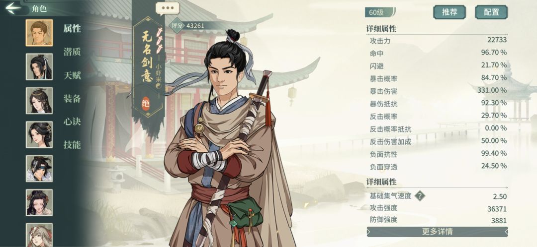 注,附加负面效果的计算公式:附加负面效果概率*(1+施加方负面穿透-承受方负面抗性)。举个例子,如果对方的负面穿透是50%,自己的负面抗性是50%,这个时候对面施加的负面效果是必中的。如果对方的负面穿透50%,自己的负面抗性100%,则有50%概率无视该控制。有些心决或者武学的负面效果不是100%触发,就要先算触发概率,再算抗性和减抗的概率。
