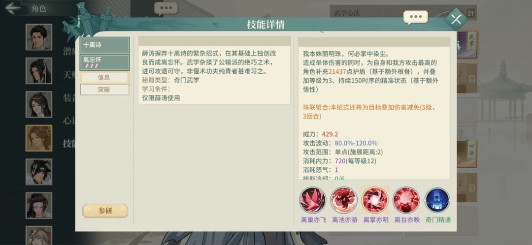 短cd的套盾技能,盾量中规中矩,但是只能给自己和攻击力最高的角色套盾(也就是刀魔主),所以说薛涛对于整体阵容的盾量贡献比常规通玄弱(比如绝白衣)。附带的伤害减免极大地强化了自身和主角的坦度,给的精准buff使刀魔不再那么惧怕闪避角色。72额外根骨达到盾量上限,69额外悟性附带的精准等级达到6级上限。